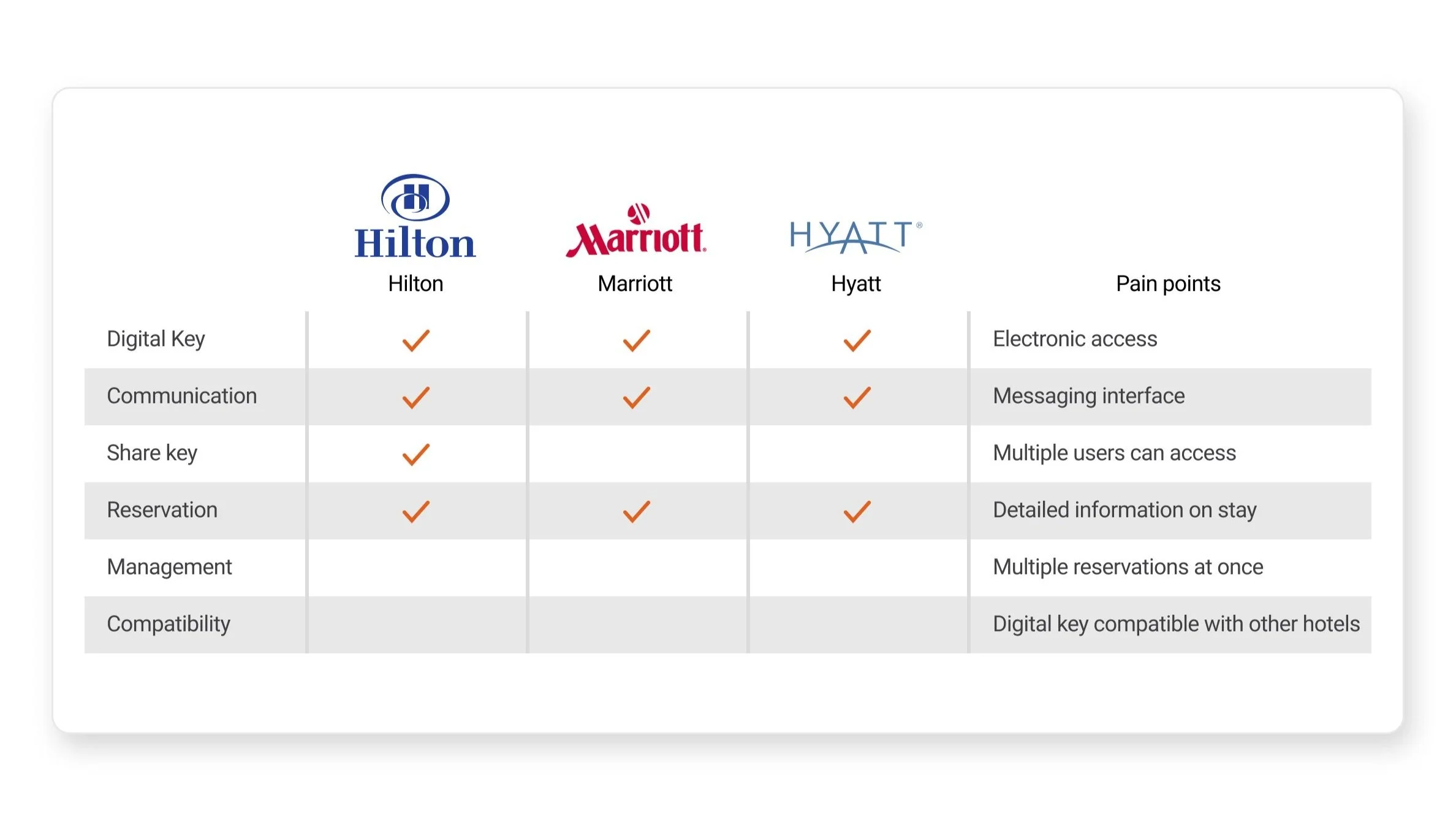 This chart represents major hotel companies like, Hilton, Marriott, Hyatt which have already implemented a digital key feature on their own hotel apps.